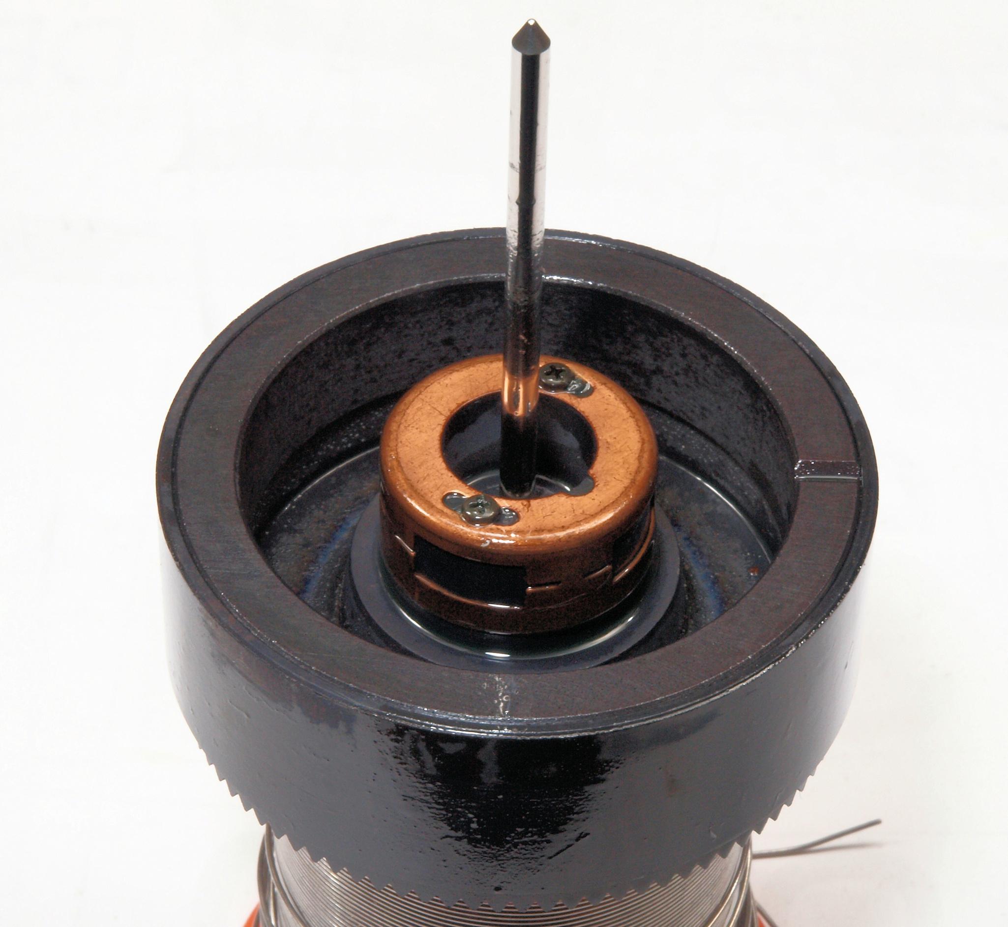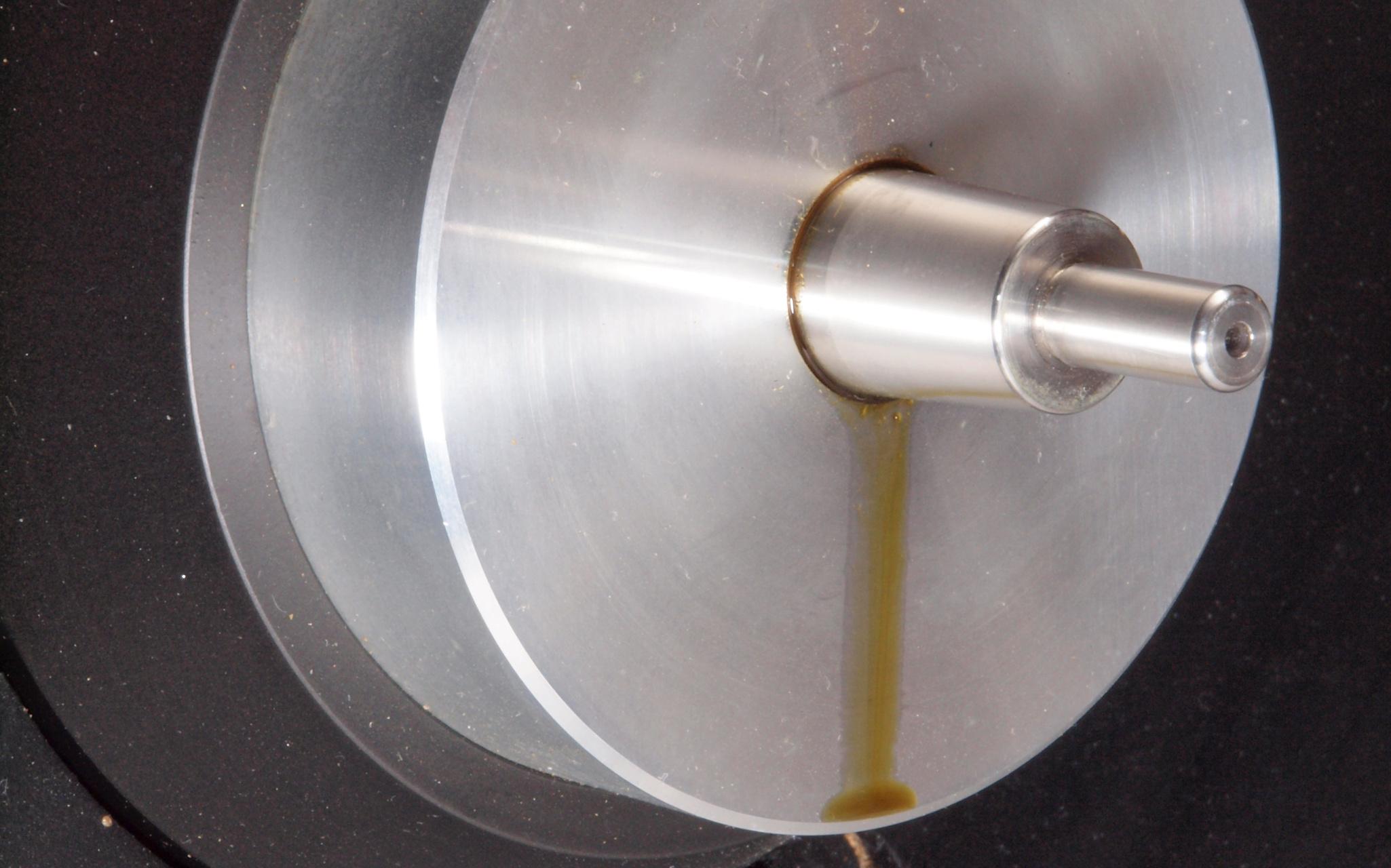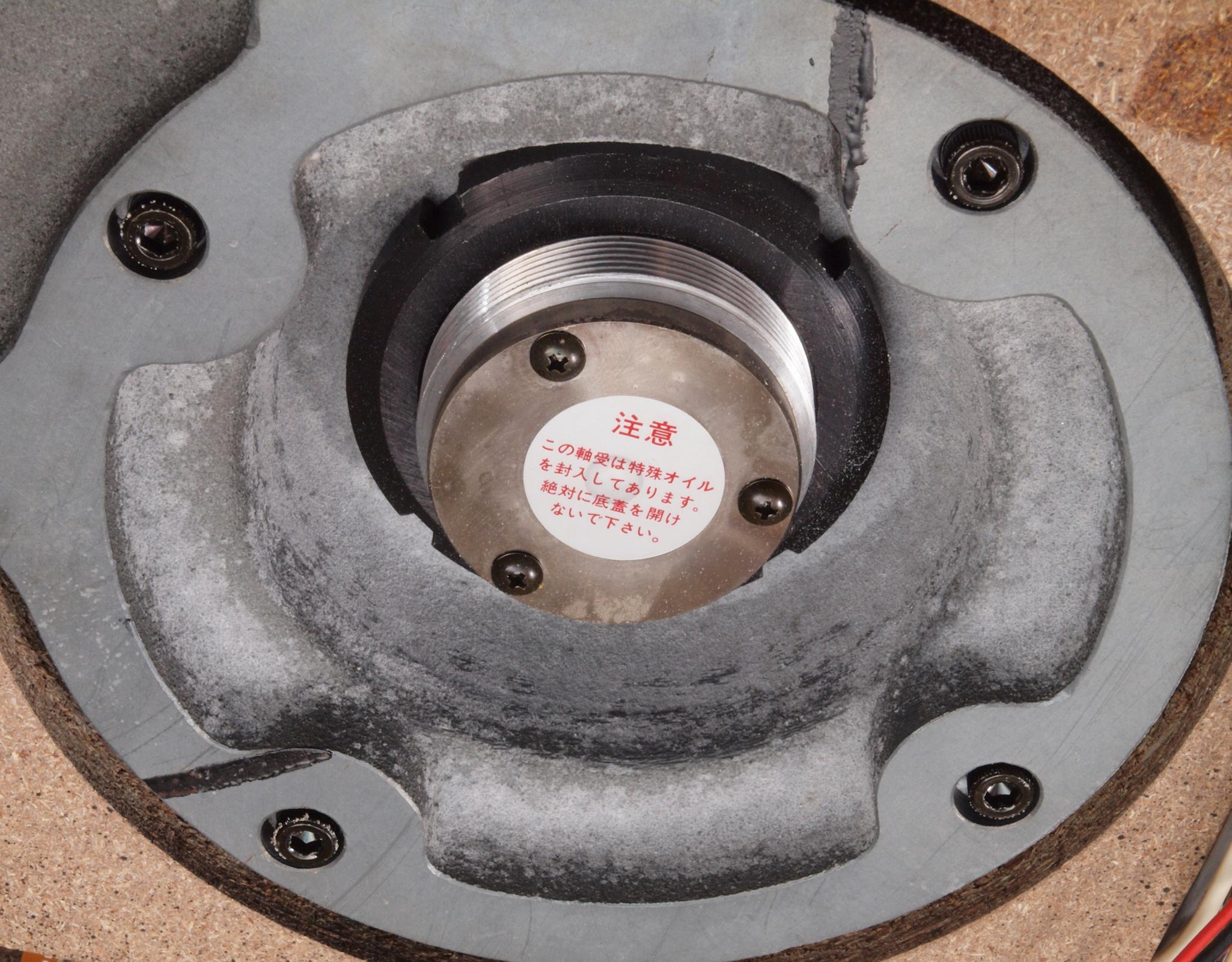 A1A. 点検中 タンテーブルを外し、上から見る。タンテーブル(プラッター)軸。粘度の低いオイルを使用した! 高負荷の軸受けは高粘度オイルを使用する。