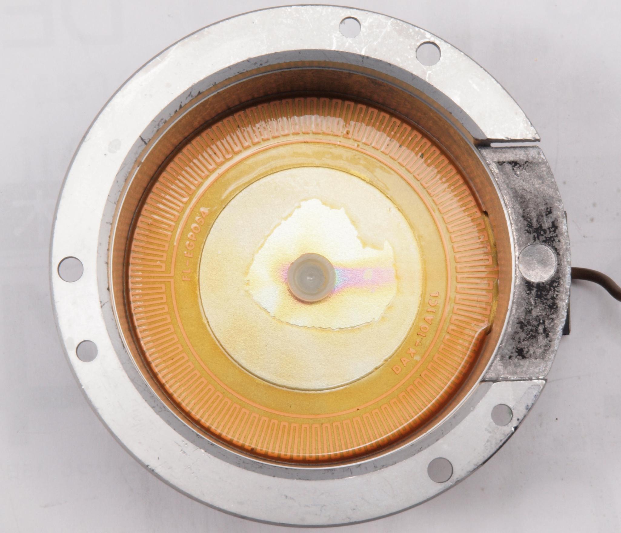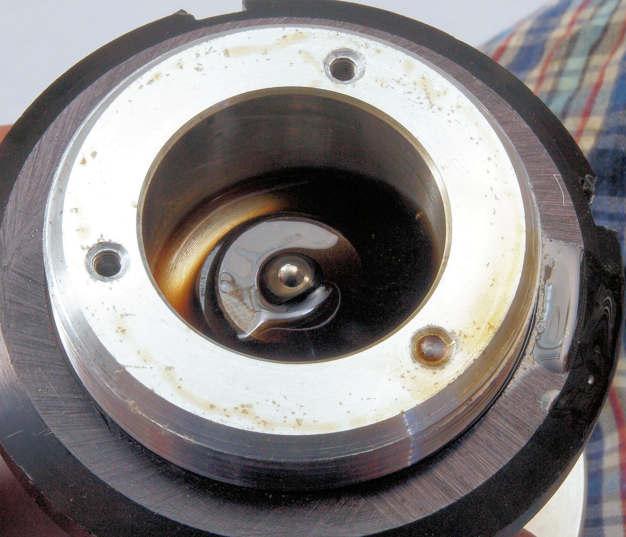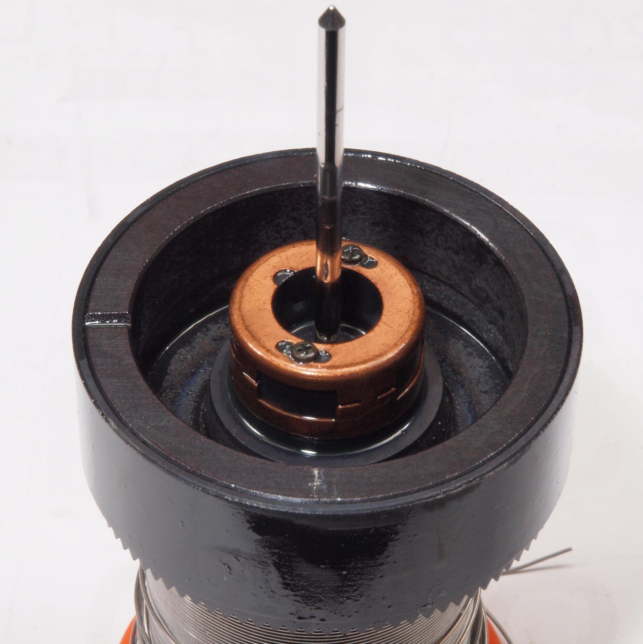 A1A. 点検中 タンテーブルを外し、上から見る。タンテーブル(プラッター)軸。粘度の低いオイルを使用した! 高負荷の軸受けは高粘度オイルを使用する。