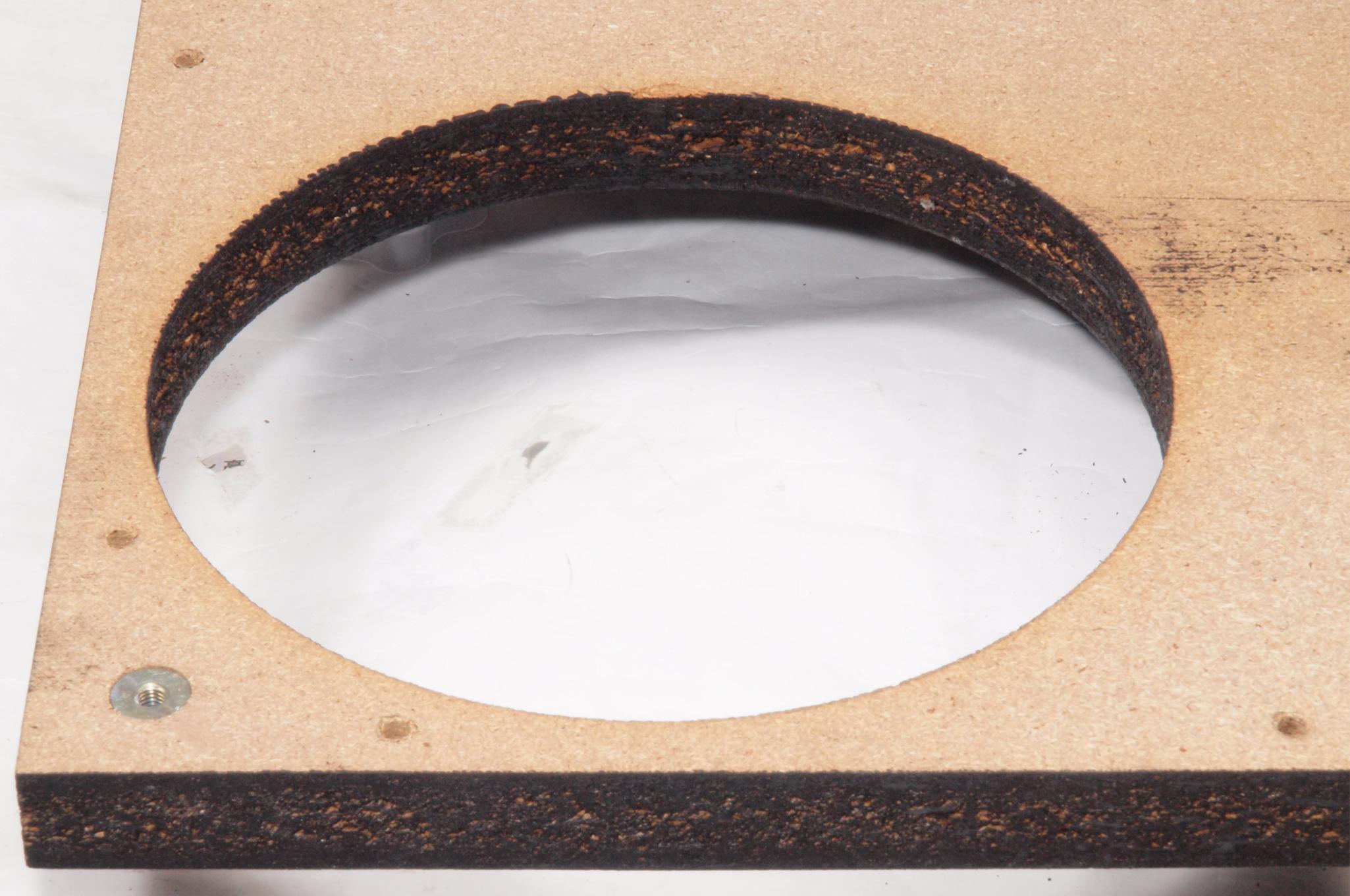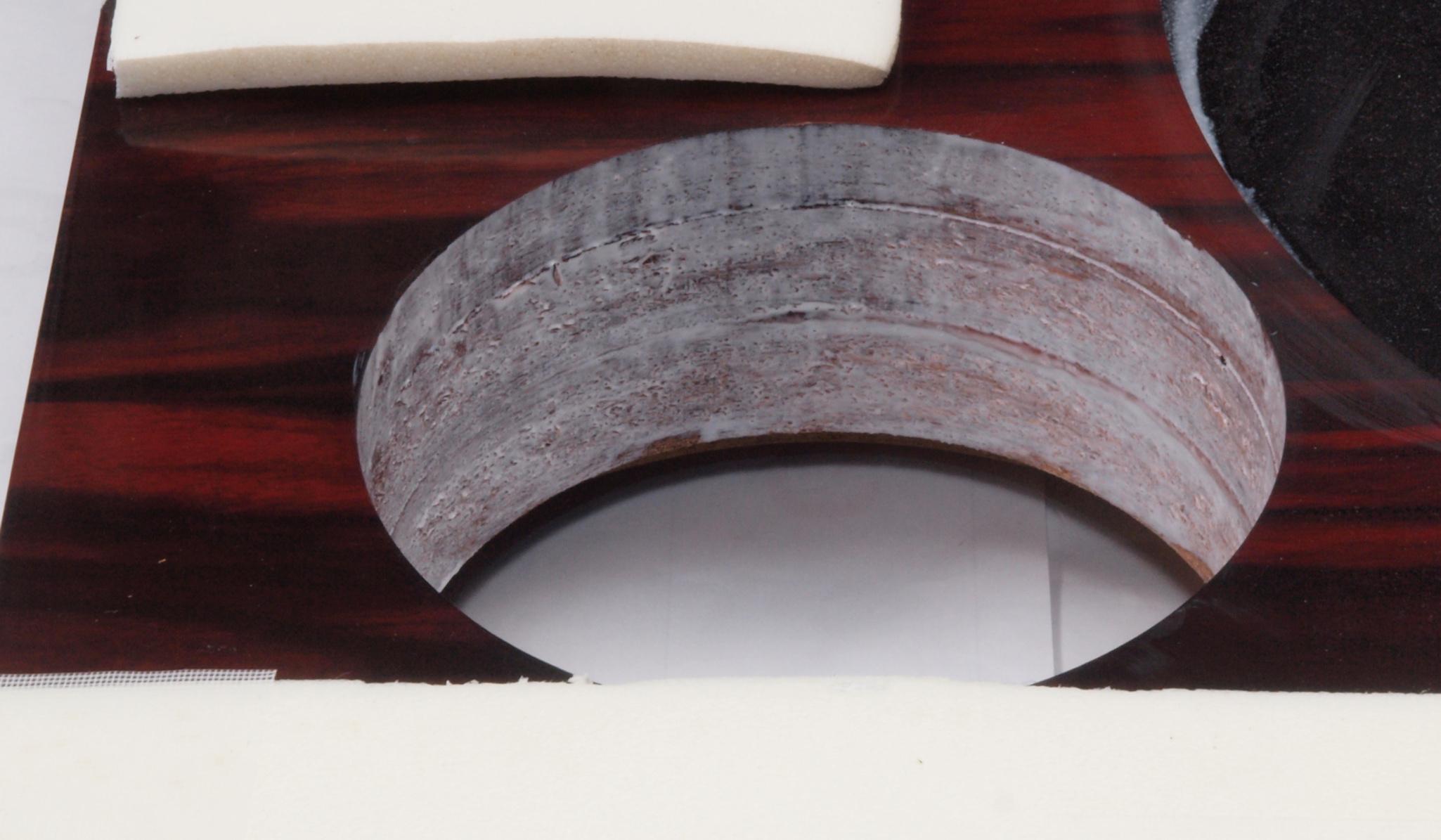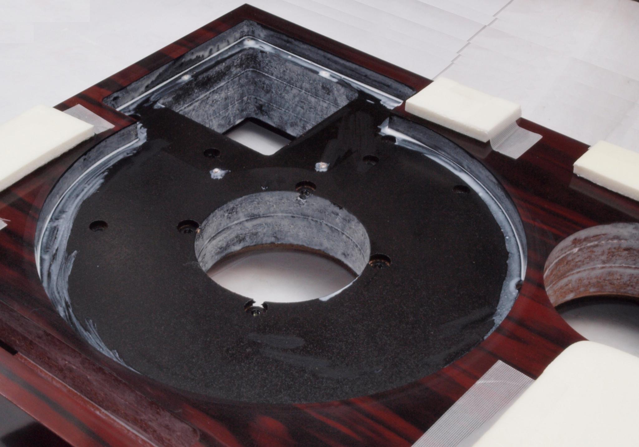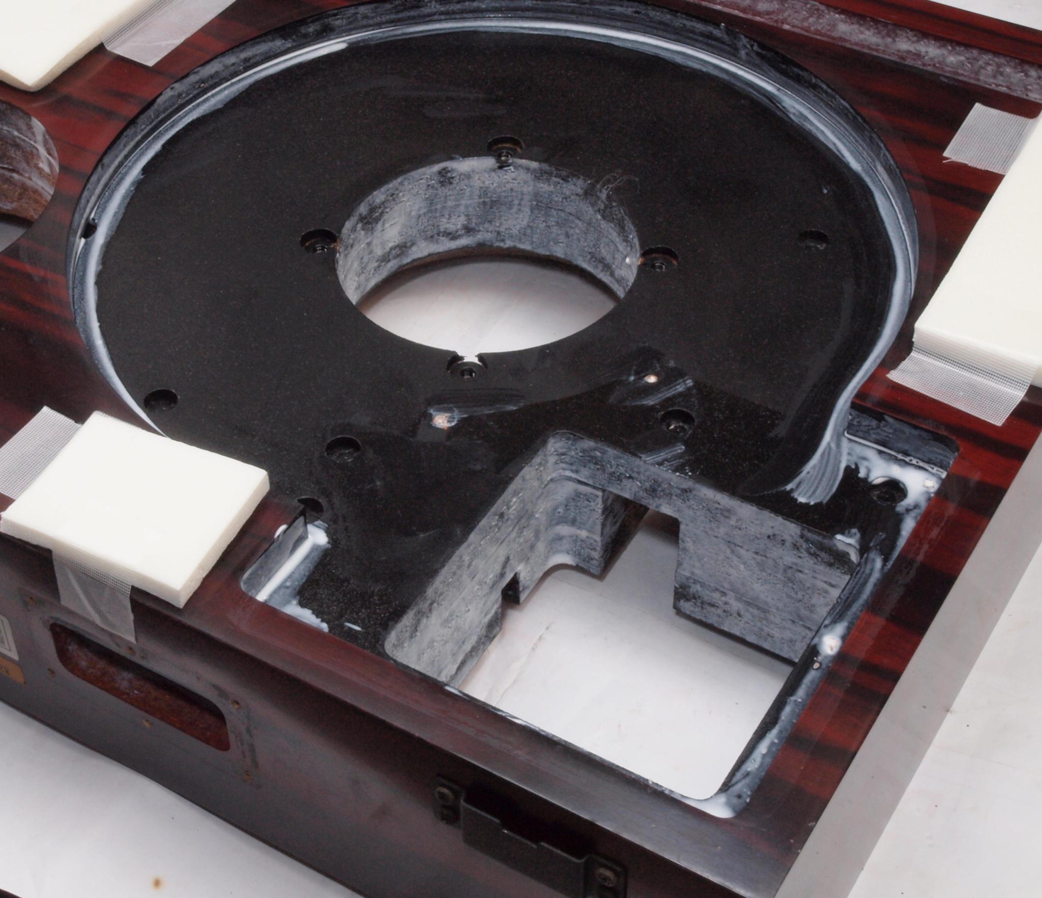 W25. 修理中 モーター取付穴、タンテーブル軸受取付穴、反対側。 圧縮材にボンドを染みこませる。