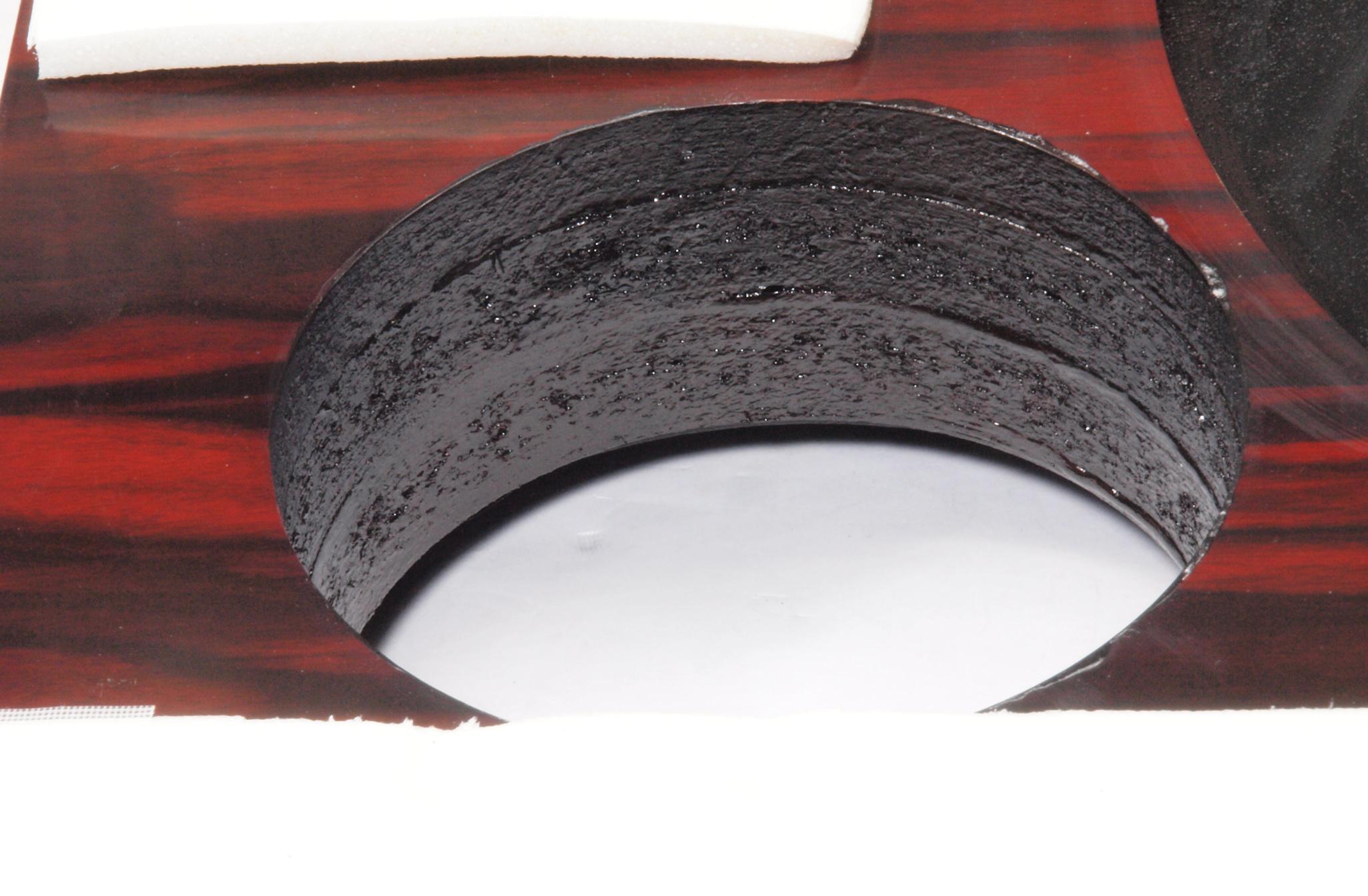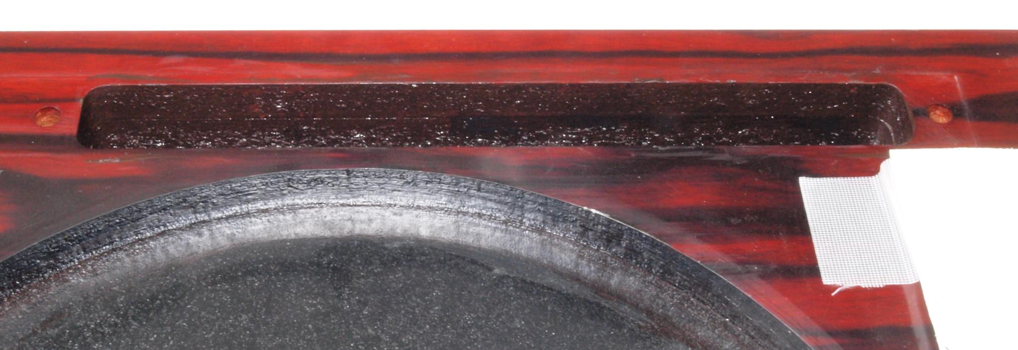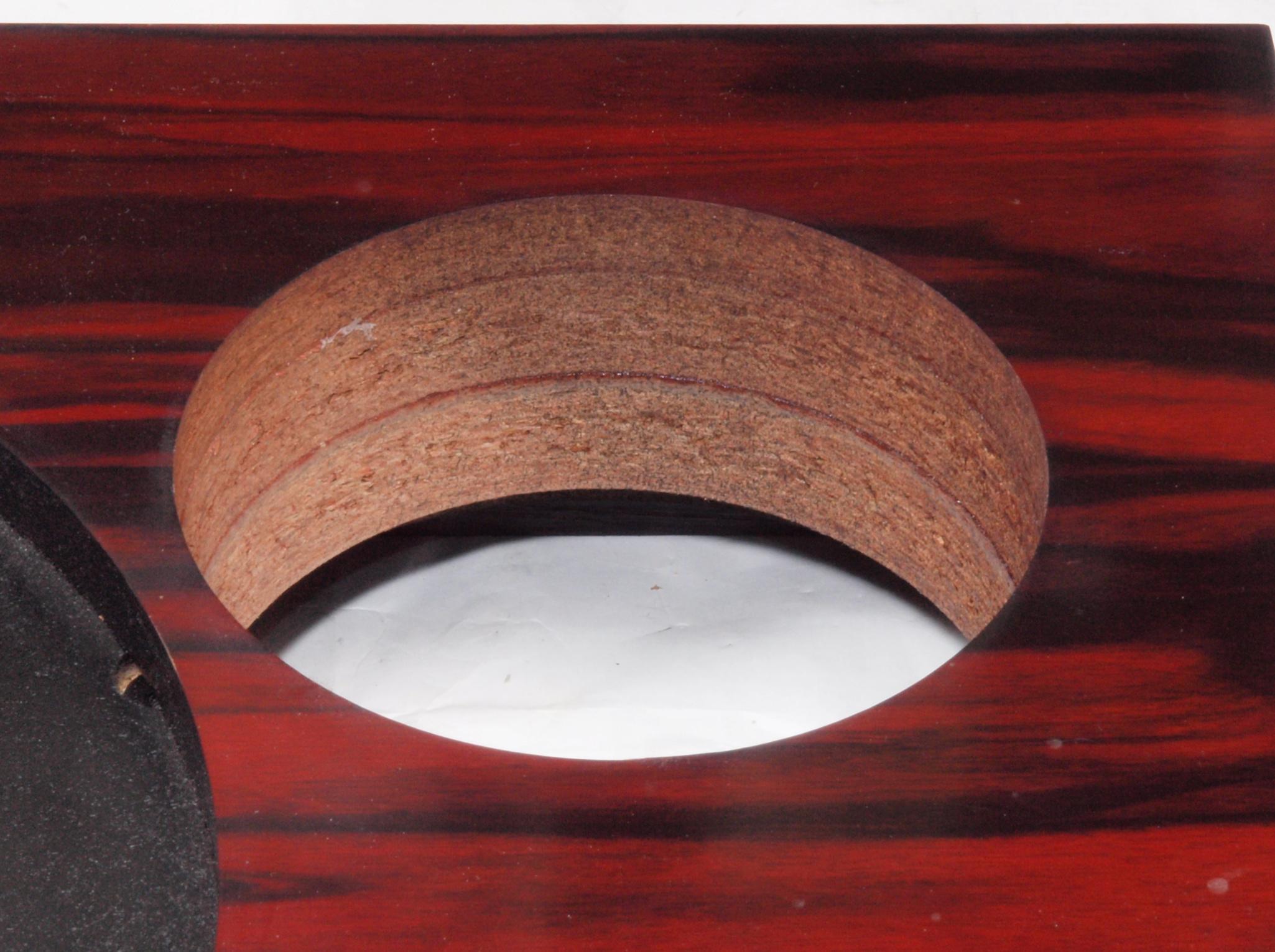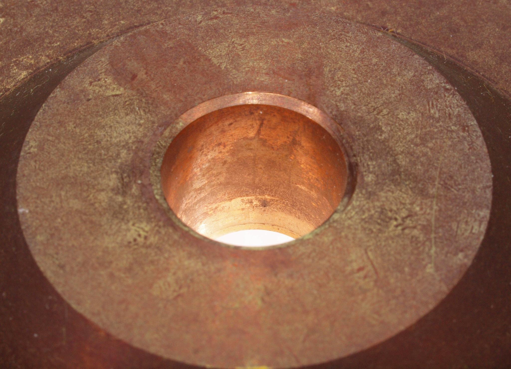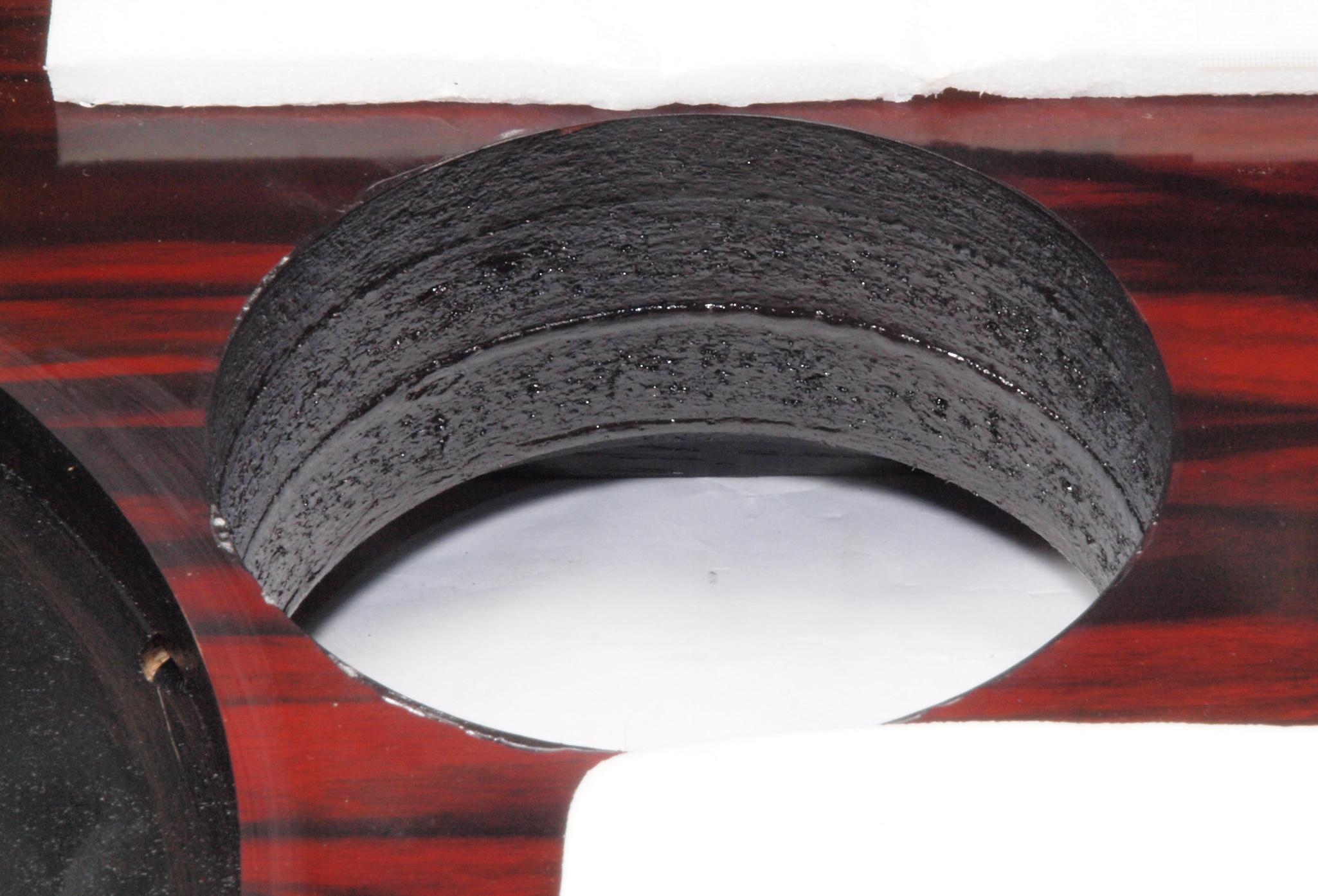 W25. 修理中 モーター取付穴、タンテーブル軸受取付穴、反対側。 圧縮材にボンドを染みこませる。
