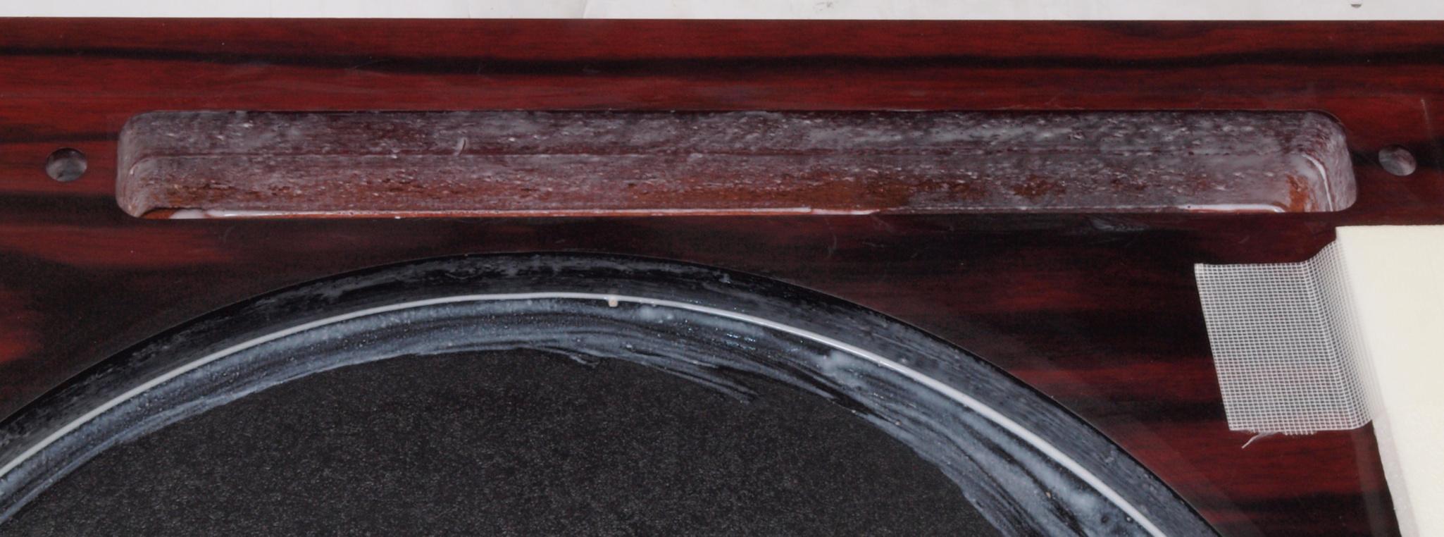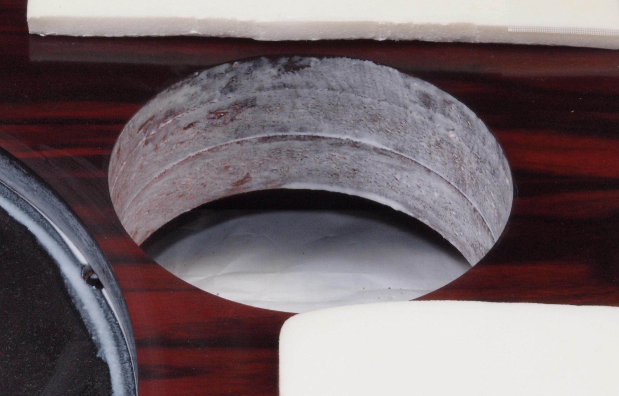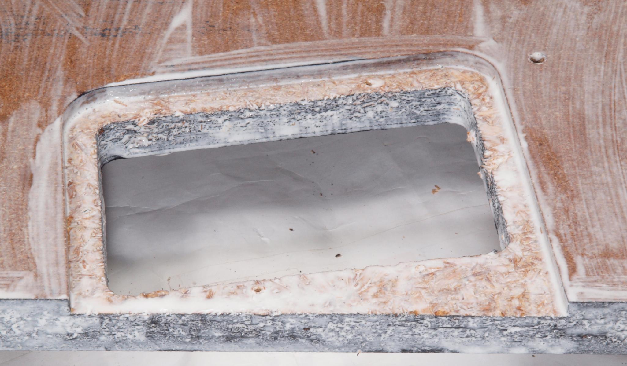 W35. 修理中 操作部取付穴、反対側。 圧縮材にボンドを染みこませる。