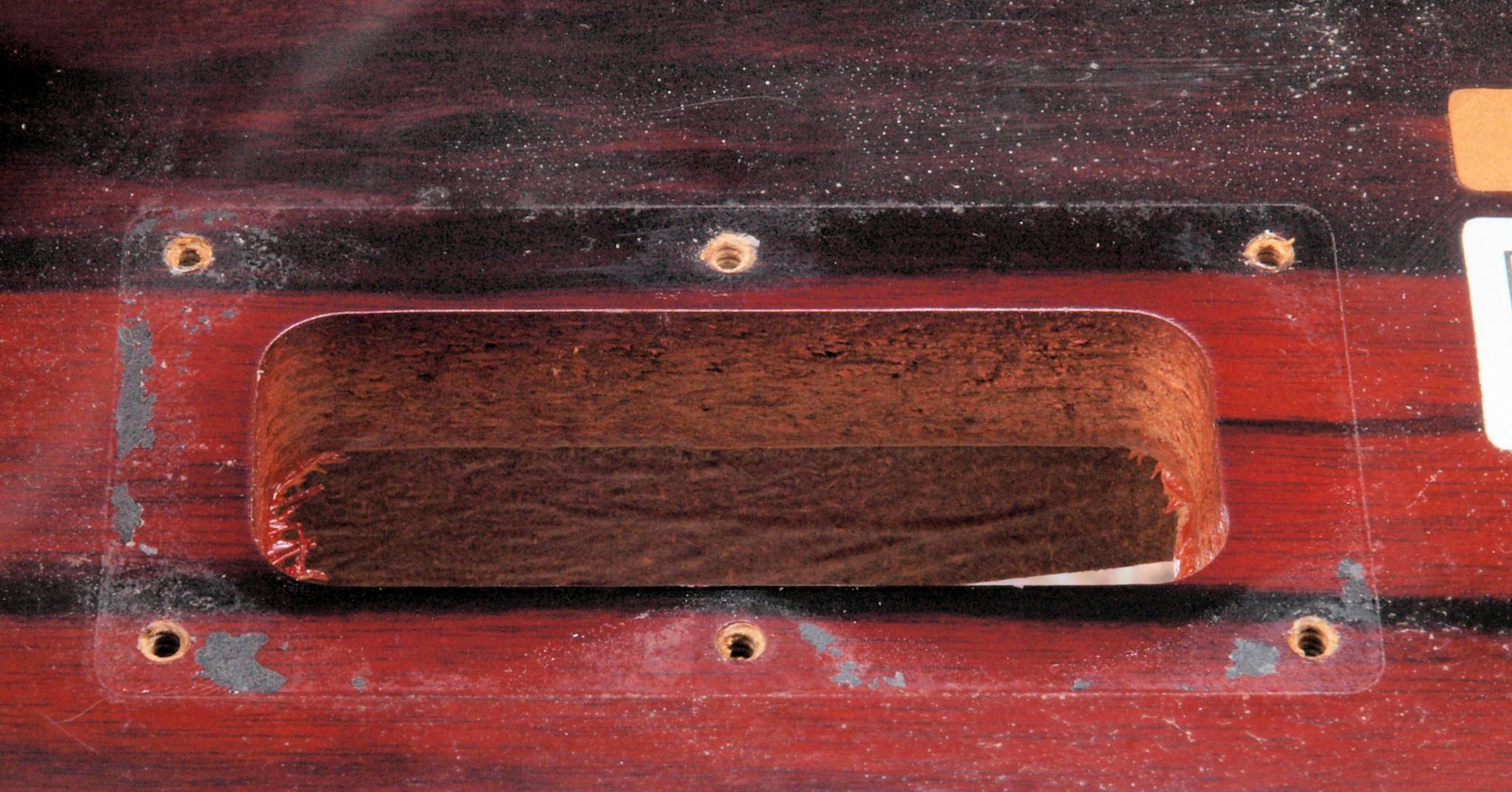 WC5. 修理中 下蓋のトランスカバー取り付穴、反対側。ボンドを染みこませる、ネジ穴も塗る。