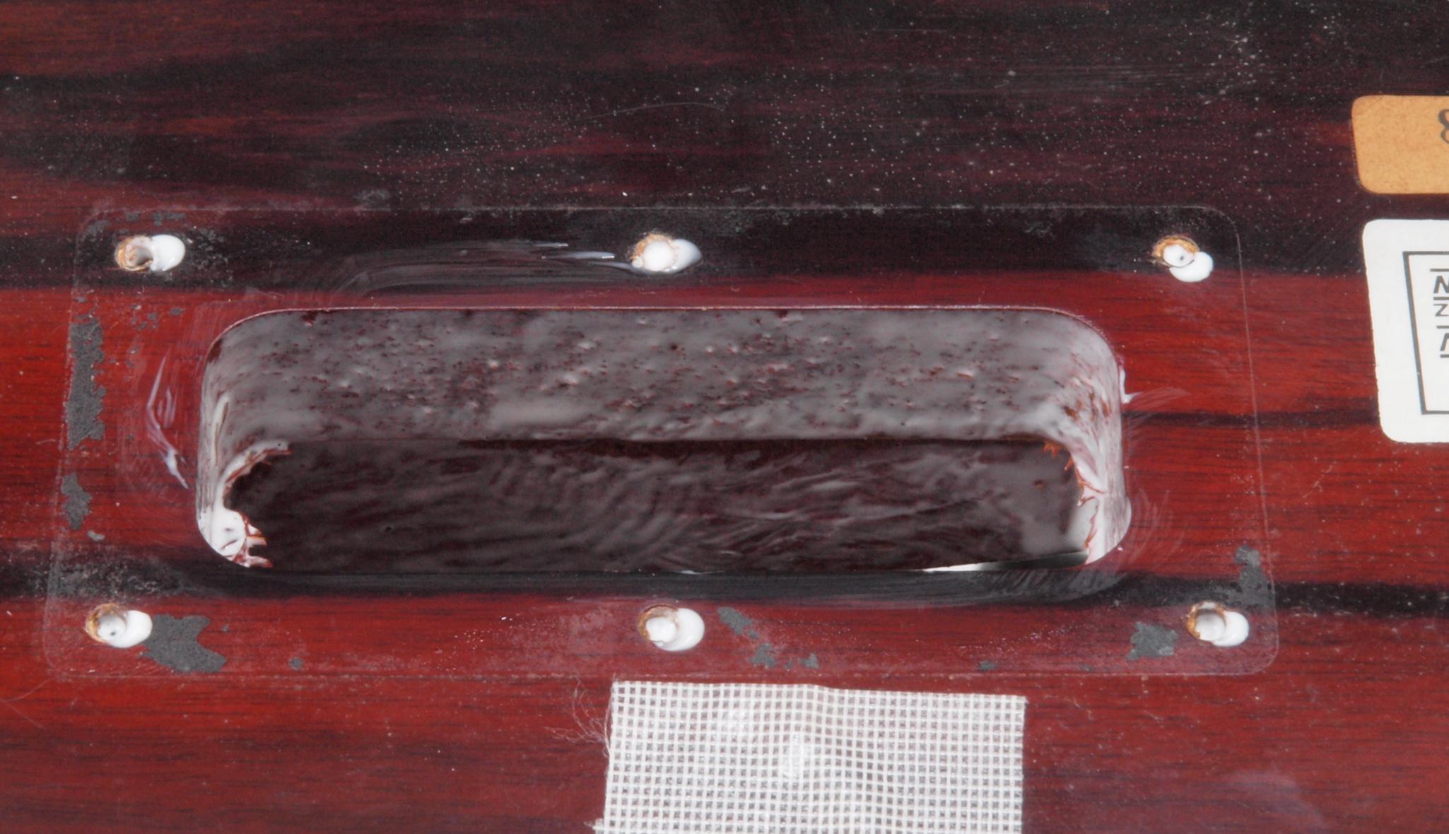 WC2. 修理中 下蓋のトランスカバー取り付穴。ボンドを染みこませる、ネジ穴も塗る。