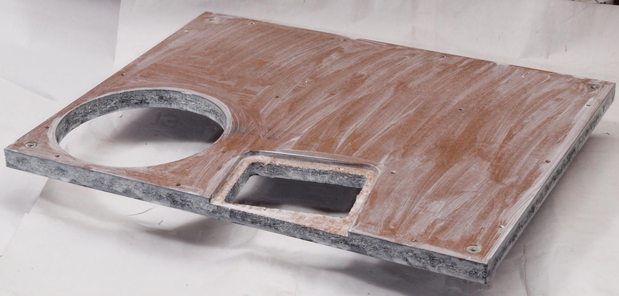 W65. 修理中 本体木枠下後。 圧縮材にボンドを染みこませる、ネジ穴も塗る。