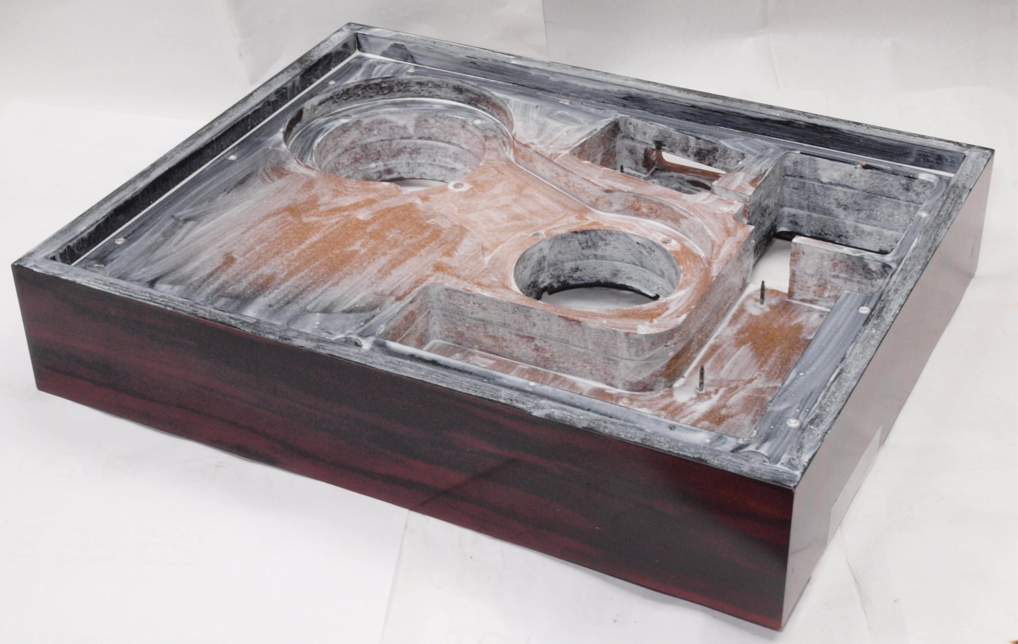 W62. 修理中 本体木枠下前。 圧縮材にボンドを染みこませる、ネジ穴も塗る。