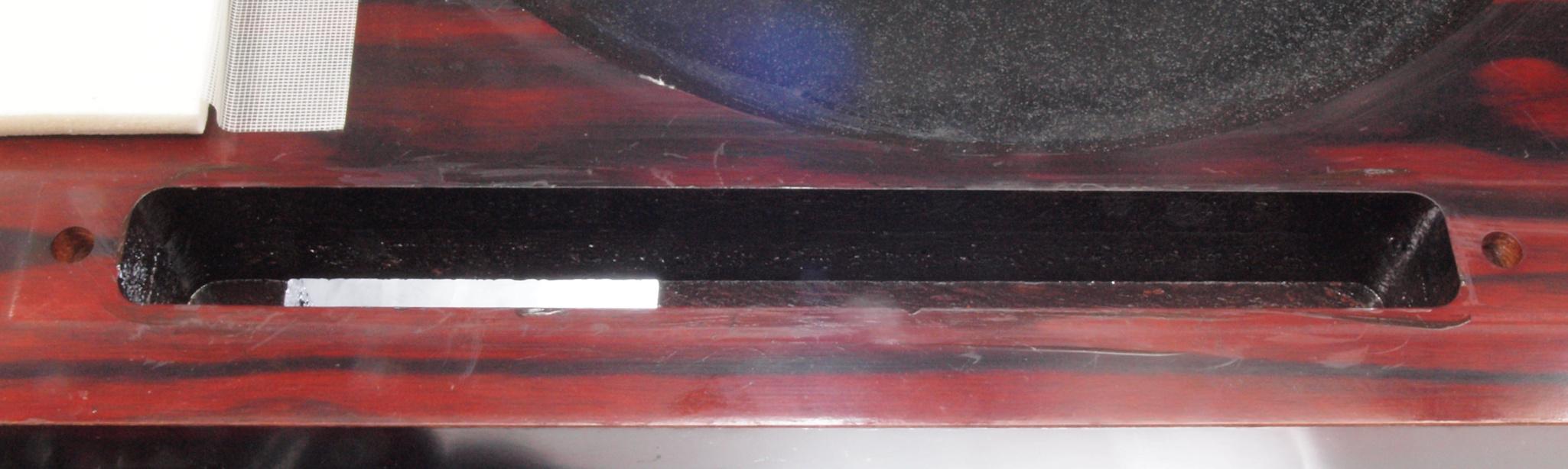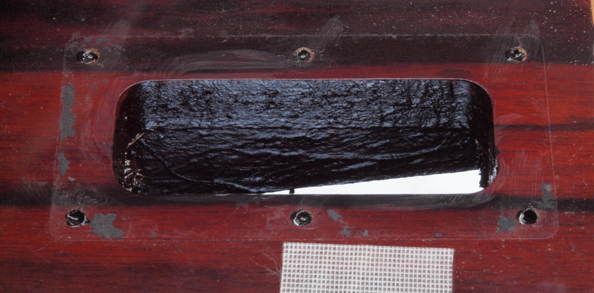 WB5. 修理中 下蓋のアーム取り付穴、反対側。ボンドを染みこませる、ネジ穴も塗る。