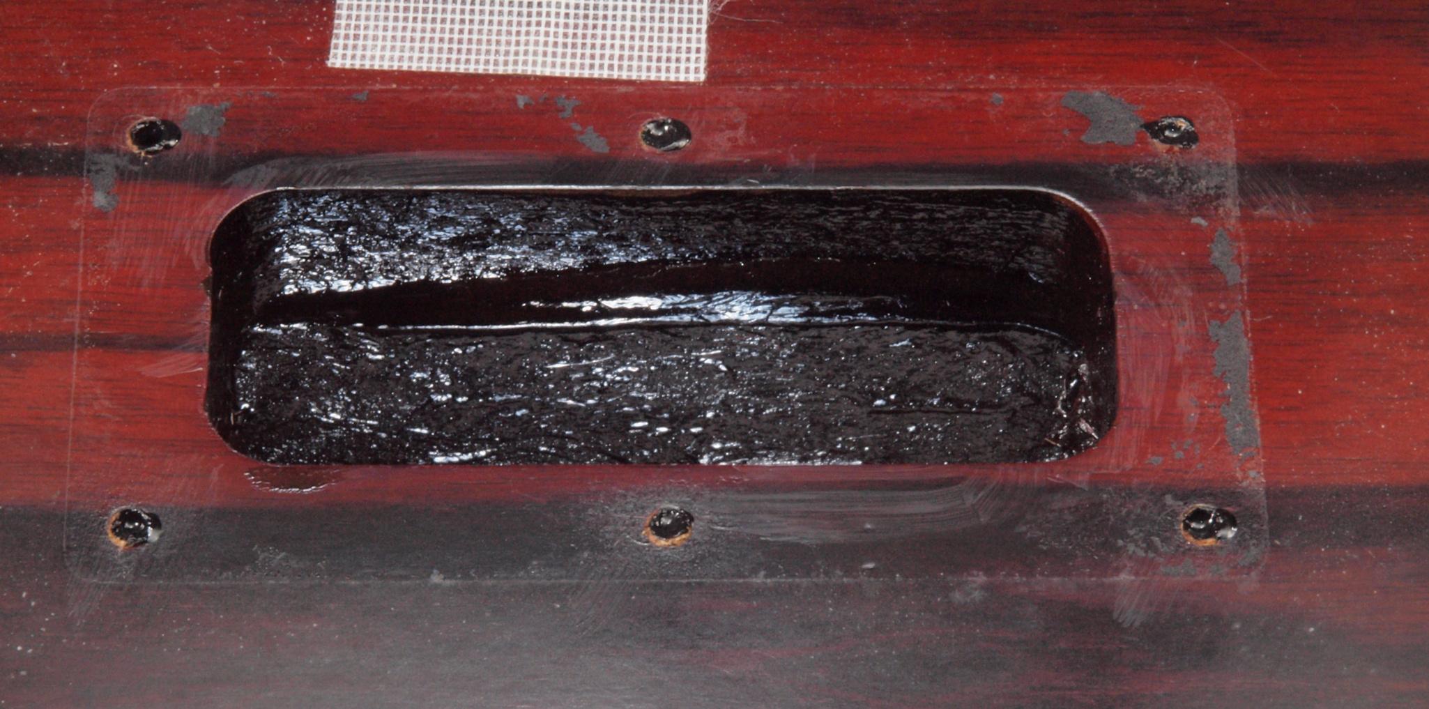 WB2. 修理中 下蓋のアーム取り付穴。ボンドを染みこませる、ネジ穴も塗る。