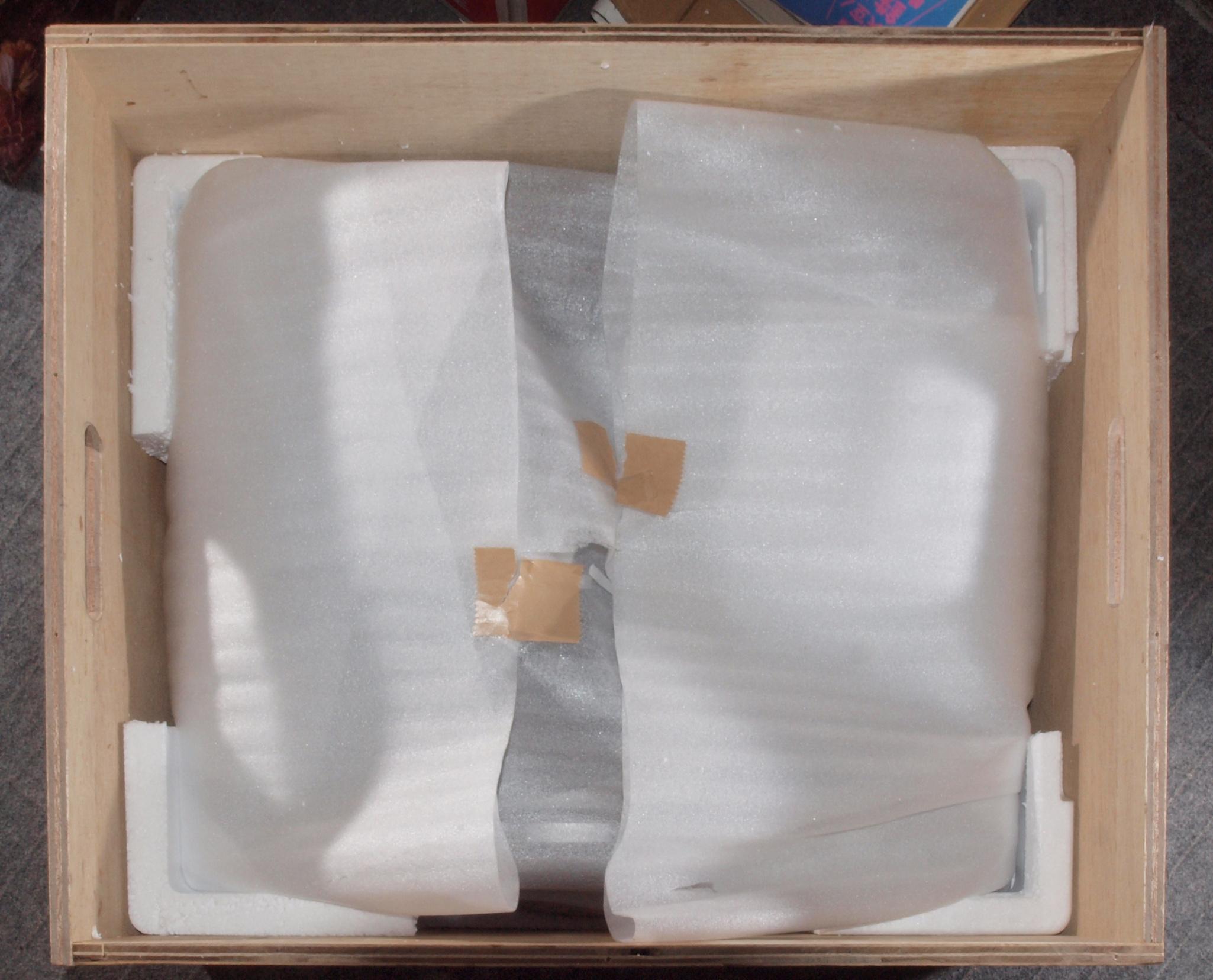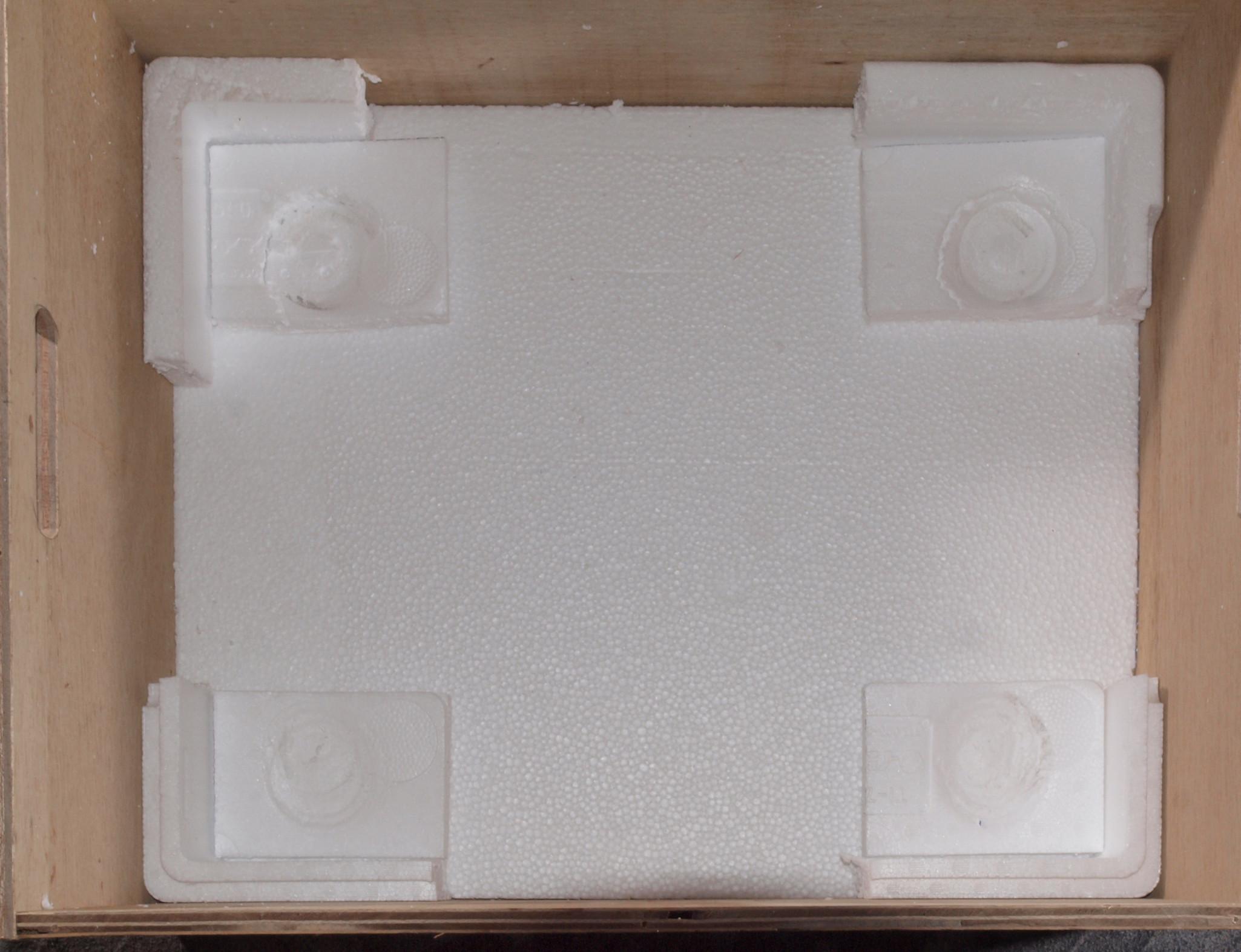 M2. 本体を入れた木箱の下の発泡スチロール。重みでかなり凹んで居る。