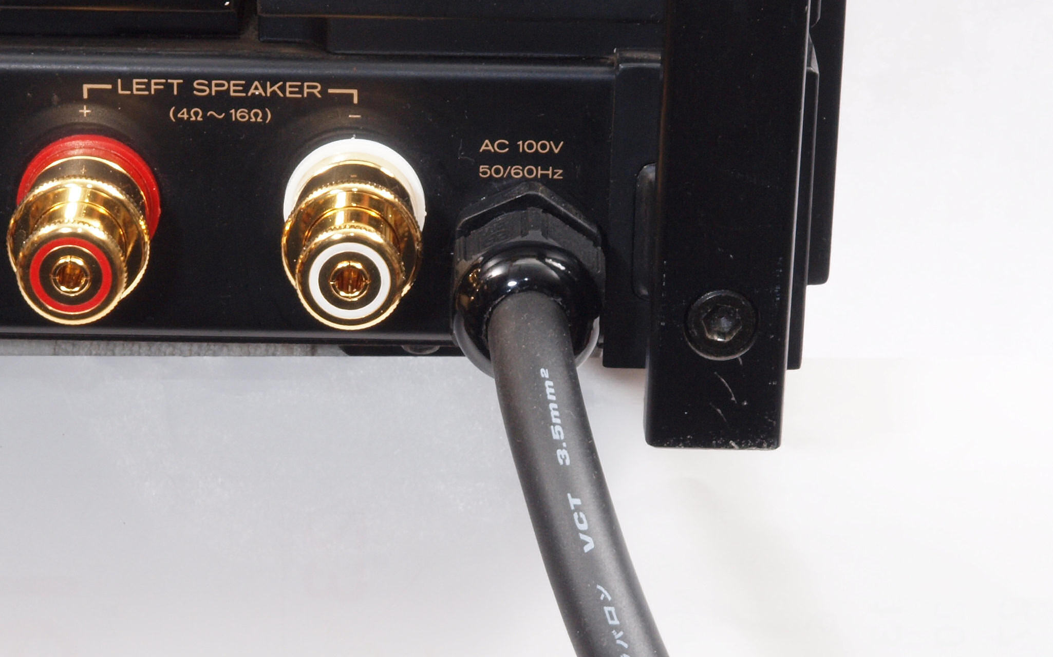| CA6. 修理後 L−SP端子裏配線。 WBTのネジ止めを生かし、ネジ止め接続+半田接続のW配線にした。理由はこちら |