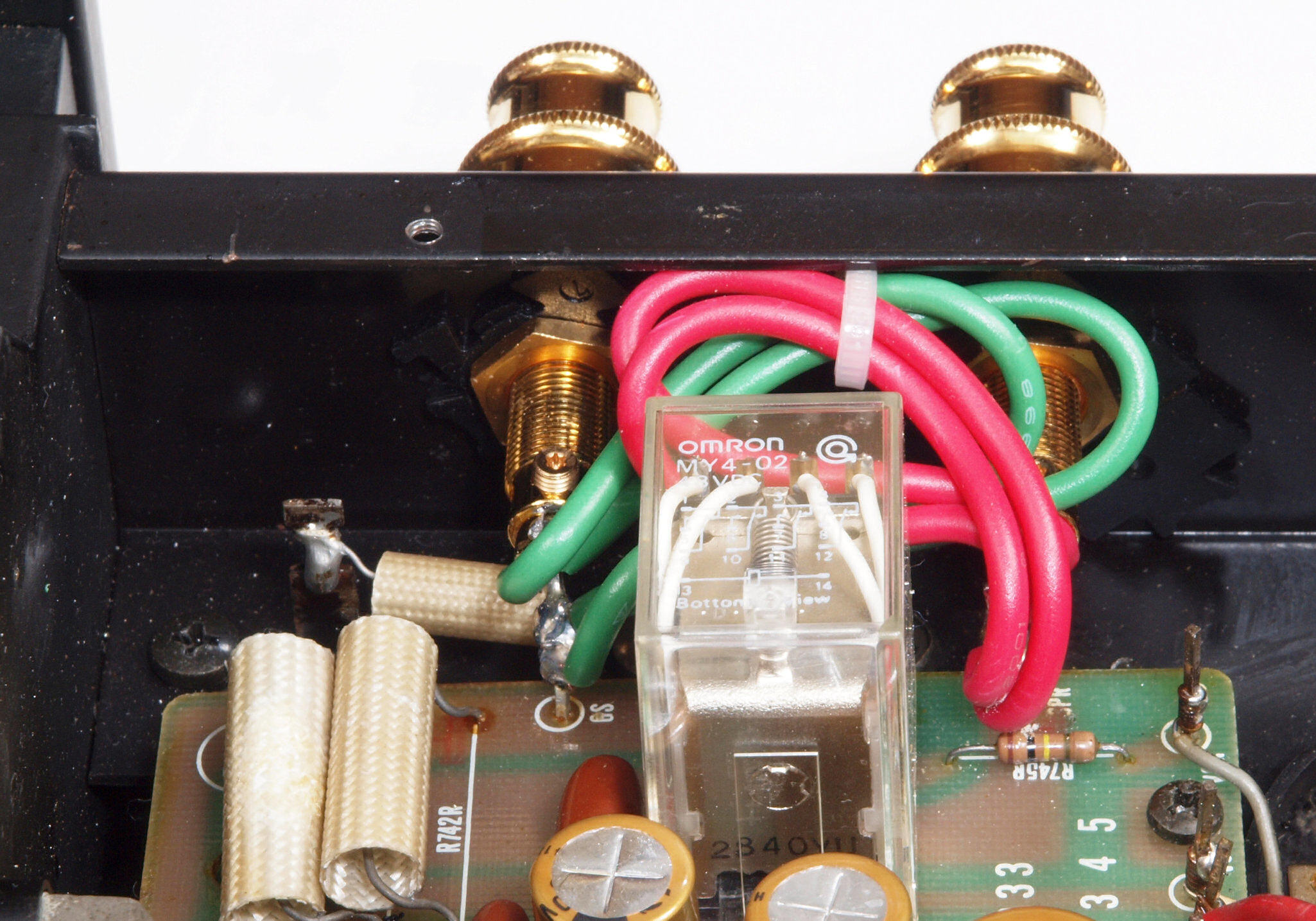 | C72. 修理後 入力RCA端子基板。 フイルムコンデンサー2個交換。 |