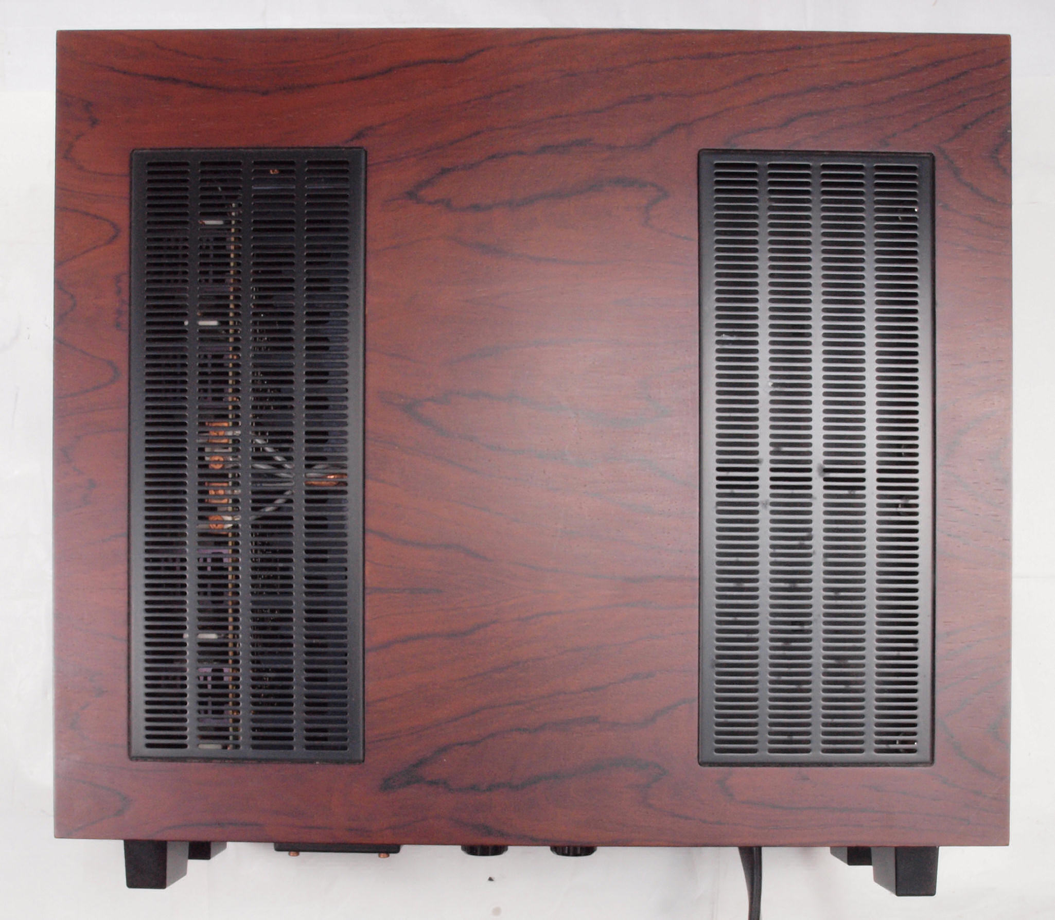 A32. 点検中 木ケースから取り出し、上から見る。 終段電源ブロック電解コンデンサーに巻いた銅箔テープ。