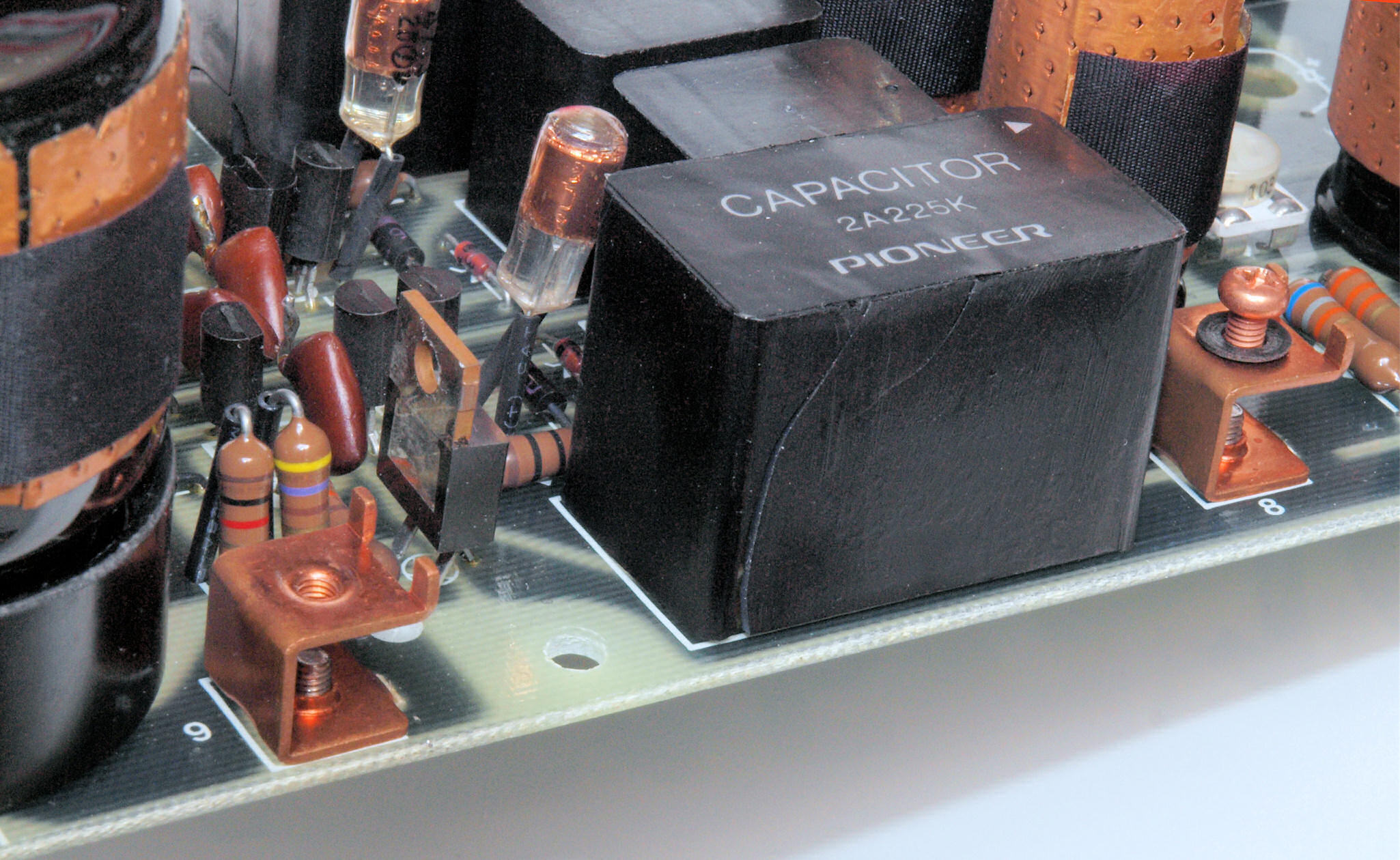 A45. 点検中 木ケースから取り出し、上から見る。 定電圧電源基板のフイルムコンデンサーのヒビ割れ その2。
