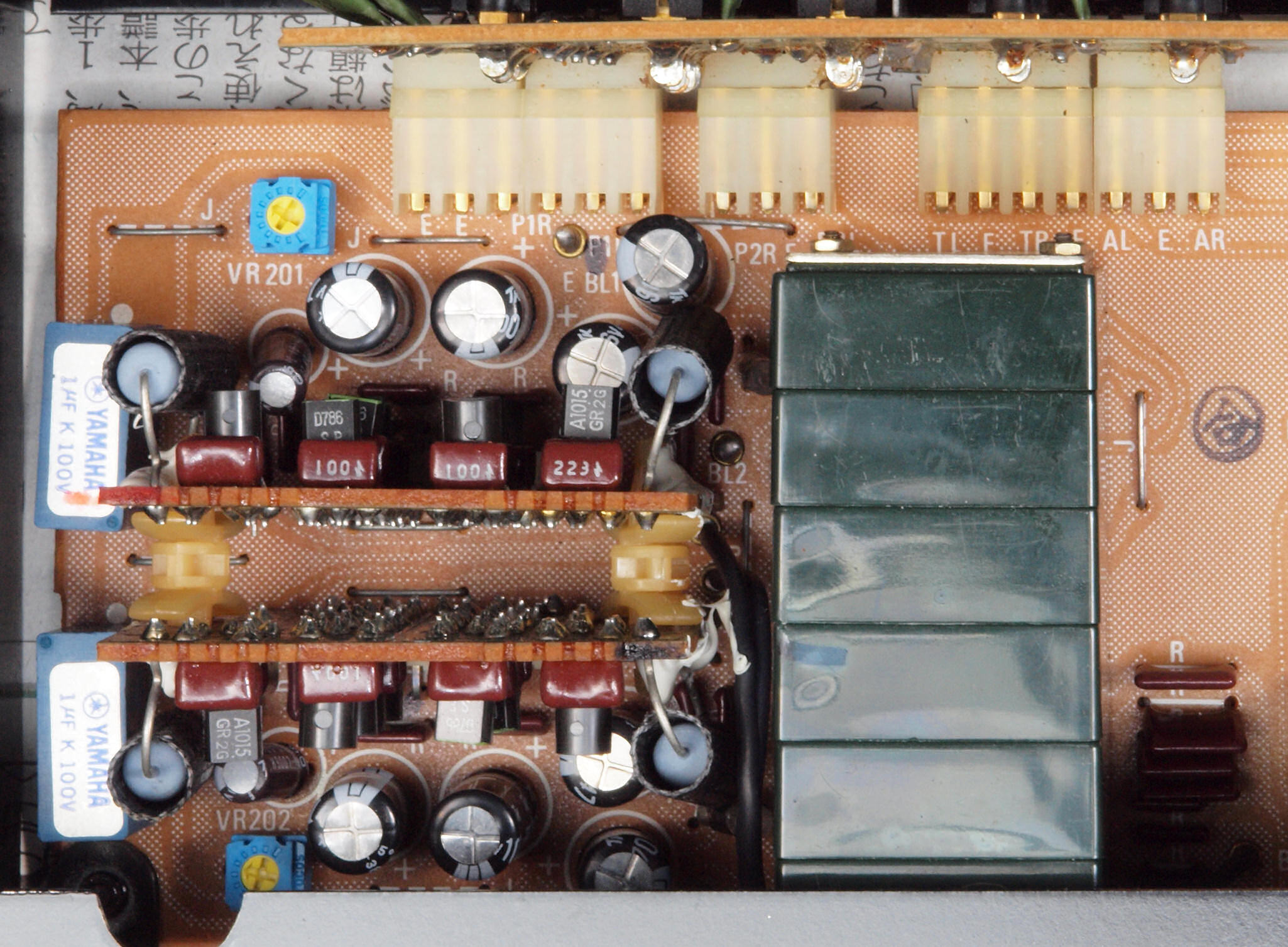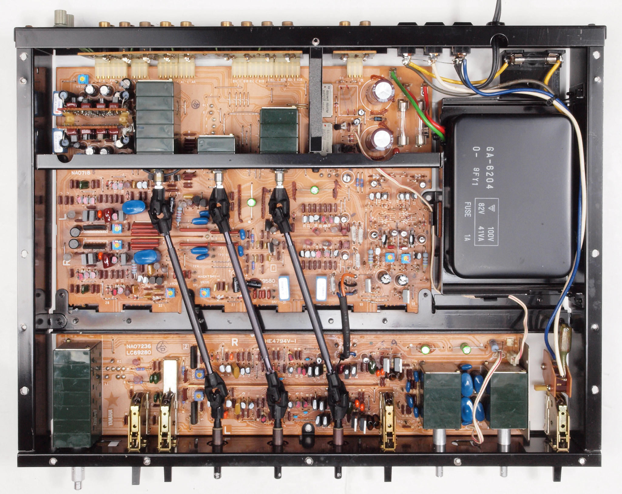 | A2A. 点検中 上下カバー、シールドを取り、下から見る。 トーンアンプ・ヤマハオリジナルの出力のフイルムコンデンサーが電解コンデンサーに交換されている。 | ||||||||||||||||||||||||||||||||||||||||||||||